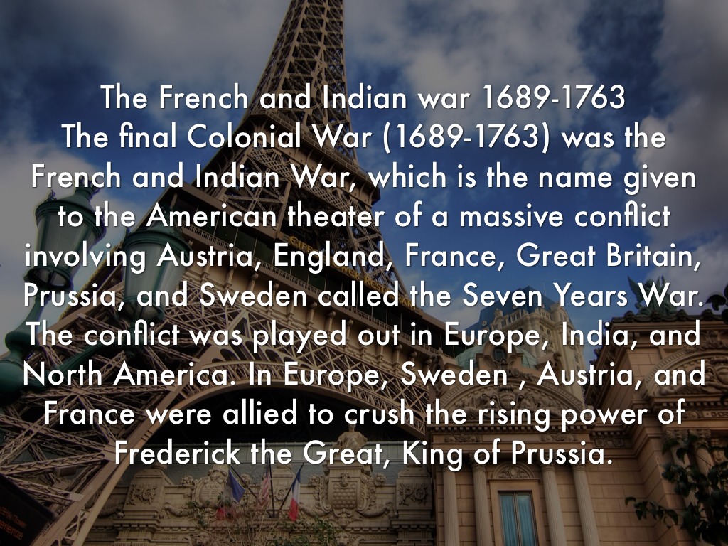 The French and Indian war 1689-1763 The final Colonial War (1689-1763) was the French and Indian War, which is the name given to the American theater of a massive conflict involving Austria, England, France, Great Britain, Prussia, and Sweden called the Seven Years War. The conflict was played out in Europe, India, and North America. In Europe, Sweden , Austria, and France were allied to crush the rising power of Frederick the Great, King of Prussia.