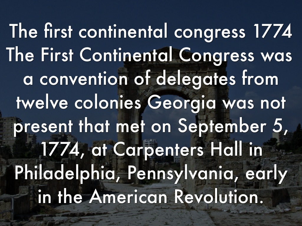 The first continental congress 1774 The First Continental Congress was a convention of delegates from twelve colonies Georgia was not present that met on September 5, 1774, at Carpenters Hall in Philadelphia, Pennsylvania, early in the American Revolution.