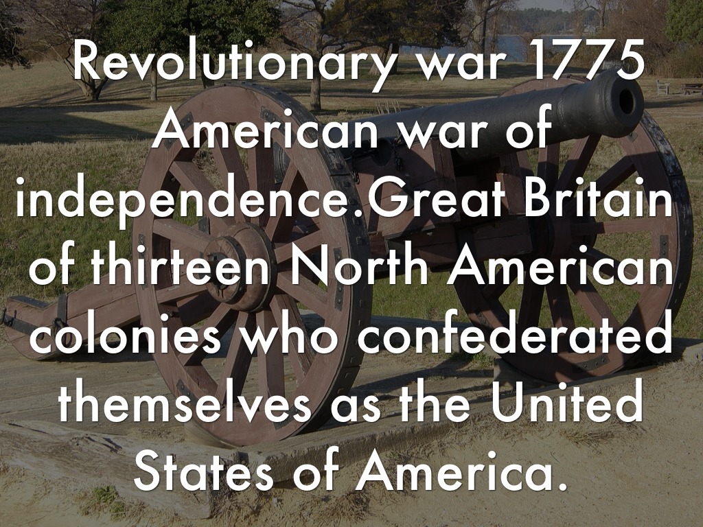 Revolutionary war 1775 American war of independence.Great Britain of thirteen North American colonies who confederated themselves as the United States of America.