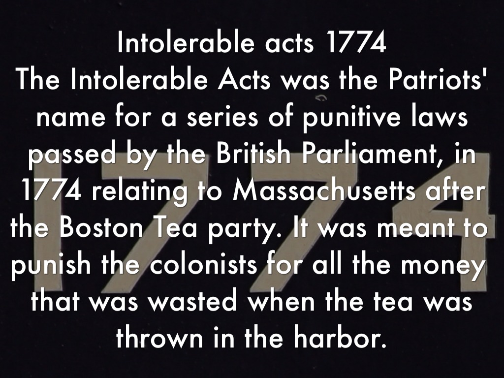 Intolerable acts 1774 The Intolerable Acts was the Patriots' name for a series of punitive laws passed by the British Parliament, in 1774 relating to Massachusetts after the Boston Tea party. It was meant to punish the colonists for all the money that was wasted when the tea was thrown in the harbor.