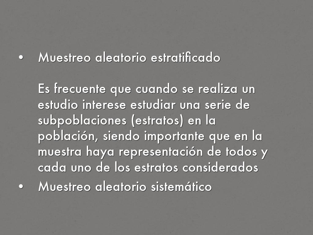 • Muestreo aleatorio estratificado Es frecuente que cuando se realiza un estudio interese estudiar una serie de subpoblaciones (estratos) en la población, siendo importante que en la muestra haya representación de todos y cada uno de los estratos considerados