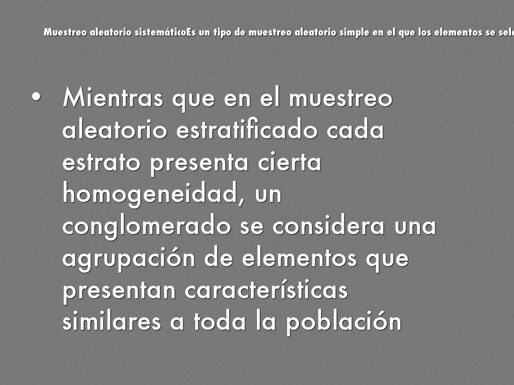 • Mientras que en el muestreo aleatorio estratificado cada estrato presenta cierta homogeneidad, un conglomerado se considera una agrupación de elementos que presentan características similares a toda la población