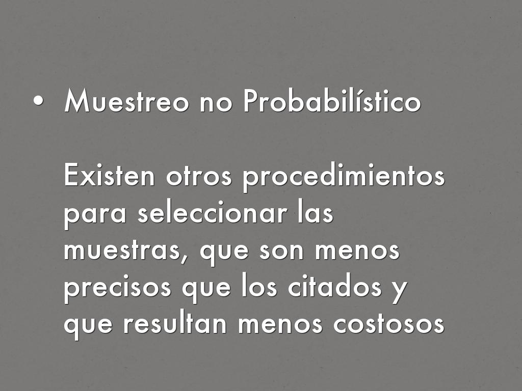 • Muestreo no Probabilístico Existen otros procedimientos para seleccionar las muestras, que son menos precisos que los citados y que resultan menos costosos