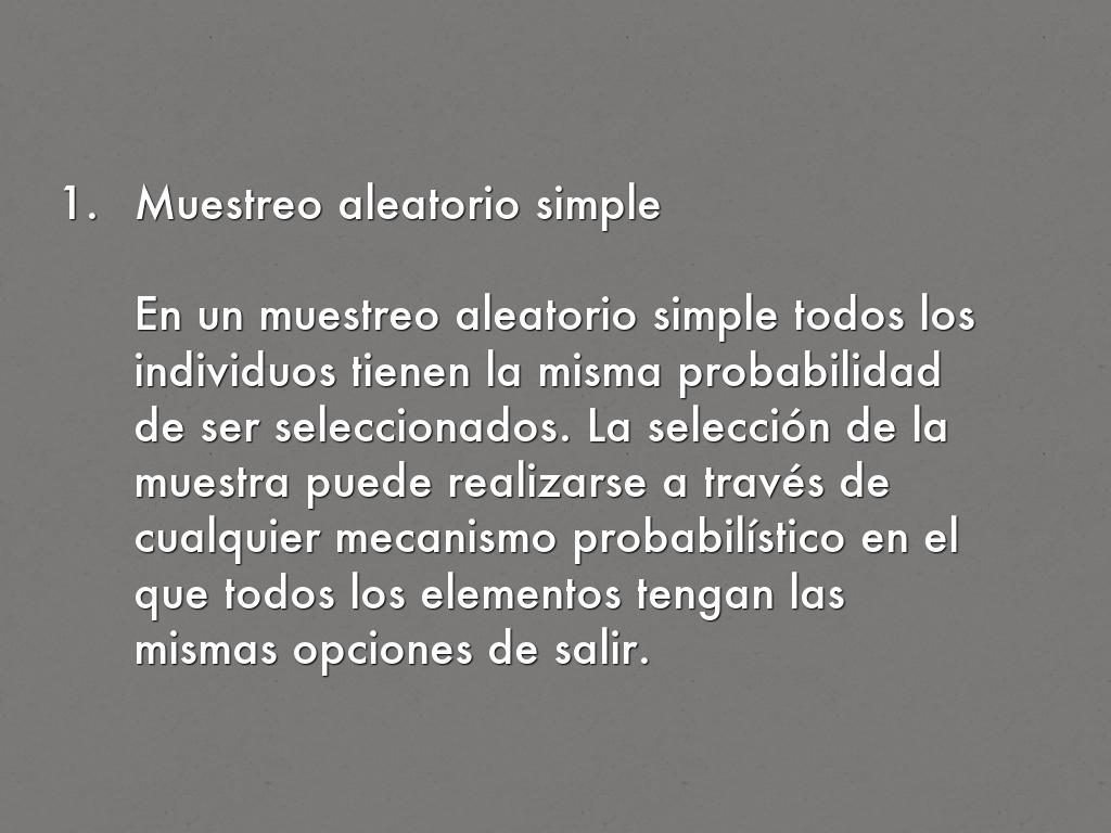 • Muestreo aleatorio simple En un muestreo aleatorio simple todos los individuos tienen la misma probabilidad de ser seleccionados. La selección de la muestra puede realizarse a través de cualquier mecanismo probabilístico en el que todos los elementos tengan las mismas opciones de salir.