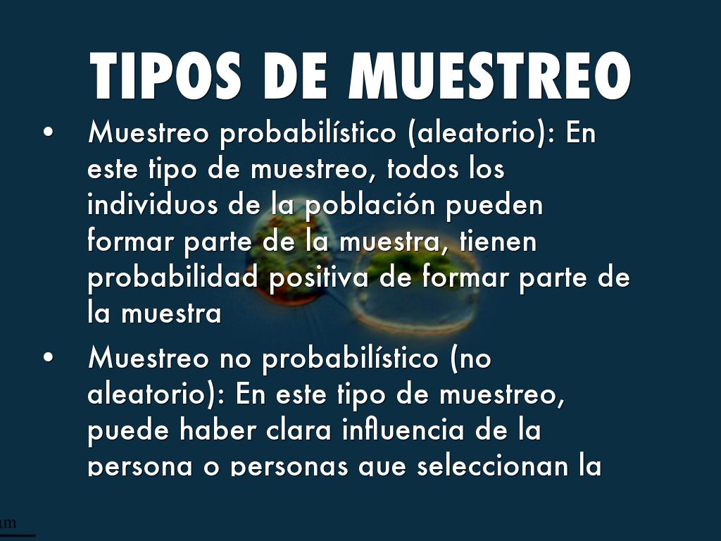 • Muestreo probabilístico (aleatorio): En este tipo de muestreo, todos los individuos de la población pueden formar parte de la muestra, tienen probabilidad positiva de formar parte de la muestra