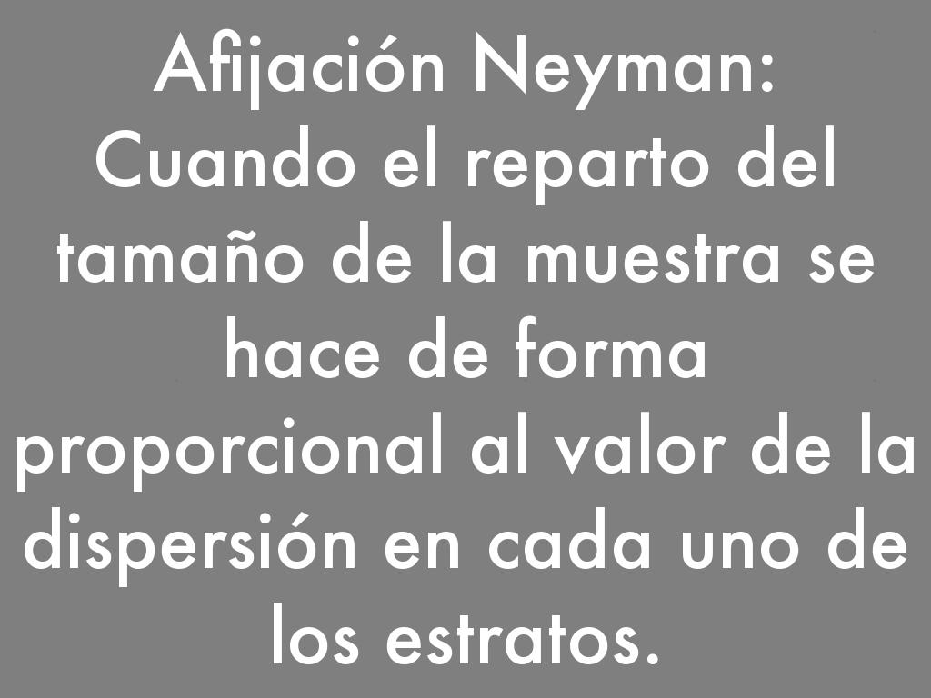 Afijación Neyman: Cuando el reparto del tamaño de la muestra se hace de forma proporcional al valor de la dispersión en cada uno de los estratos.