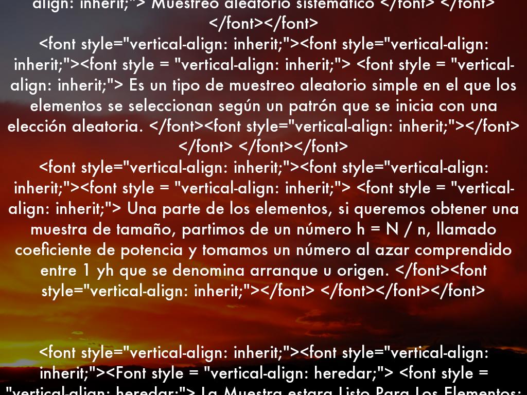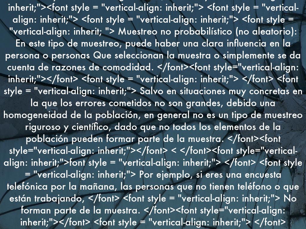 Muestreo no probabilístico (no aleatorio): En este tipo de muestreo, puede haber una clara influencia en la persona o personas Que seleccionan la muestra o simplemente se da cuenta de razones de comodidad. Salvo en situaciones muy concretas en la que los errores cometidos no son grandes, debido una homogeneidad de la población, en general no es un tipo de muestreo riguroso y científico, dado que no todos los elementos de la población pueden formar parte de la muestra. < font style = "vertical-align: inherit;"> Por ejemplo, si eres una encuesta telefónica por la mañana, las personas que no tienen teléfono o que están trabajando, No forman parte de la muestra.