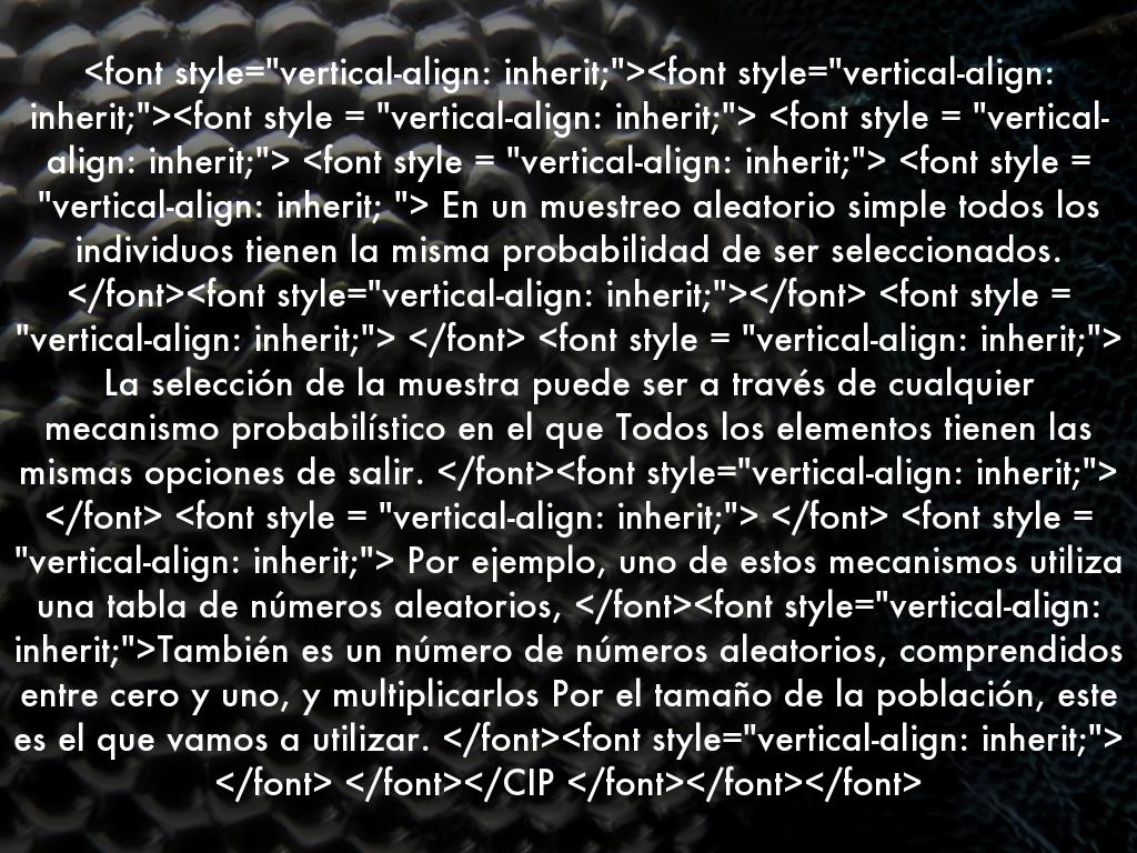 En un muestreo aleatorio simple todos los individuos tienen la misma probabilidad de ser seleccionados. La selección de la muestra puede ser a través de cualquier mecanismo probabilístico en el que Todos los elementos tienen las mismas opciones de salir. Por ejemplo, uno de estos mecanismos utiliza una tabla de números aleatorios, También es un número de números aleatorios, comprendidos entre cero y uno, y multiplicarlos Por el tamaño de la población, este es el que vamos a utilizar.