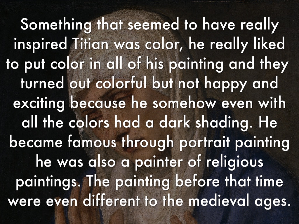 Something that seemed to have really inspired Titian was color, he really liked to put color in all of his painting and they turned out colorful but not happy and exciting because he somehow even with all the colors had a dark shading. He became famous through portrait painting he was also a painter of religious paintings. The painting before that time were even different to the medieval ages.