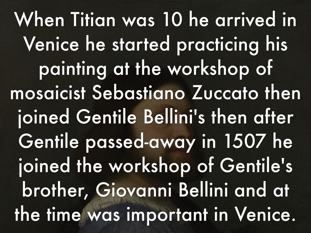 When Titian was 10 he arrived in Venice he started practicing his painting at the workshop of mosaicist Sebastiano Zuccato then joined Gentile Bellini's then after Gentile passed-away in 1507 he joined the workshop of Gentile's brother, Giovanni Bellini and at the time was important in Venice.