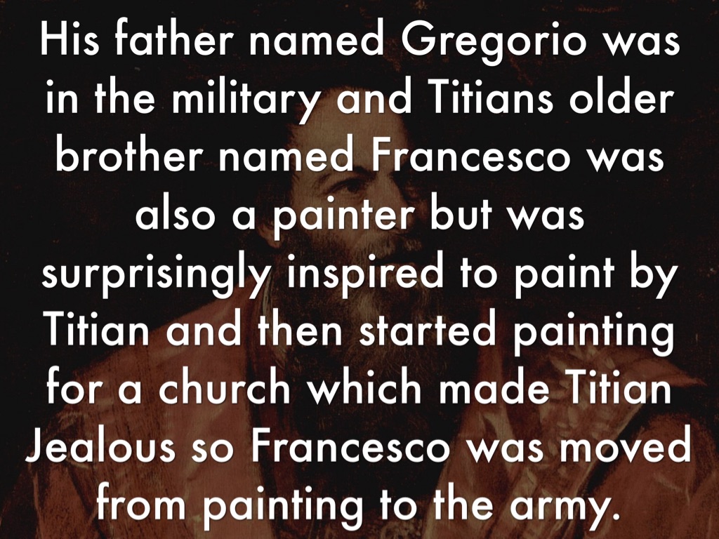 His father named Gregorio was in the military and Titians older brother named Francesco was also a painter but was surprisingly inspired to paint by Titian and then started painting for a church which made Titian Jealous so Francesco was moved from painting to the army.
