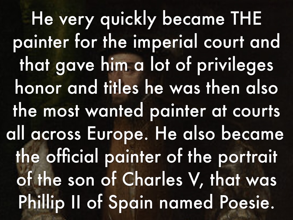 He very quickly became THE painter for the imperial court and that gave him a lot of privileges honor and titles he was then also the most wanted painter at courts all across Europe. He also became the official painter of the portrait of the son of Charles V, that was Phillip II of Spain named Poesie.