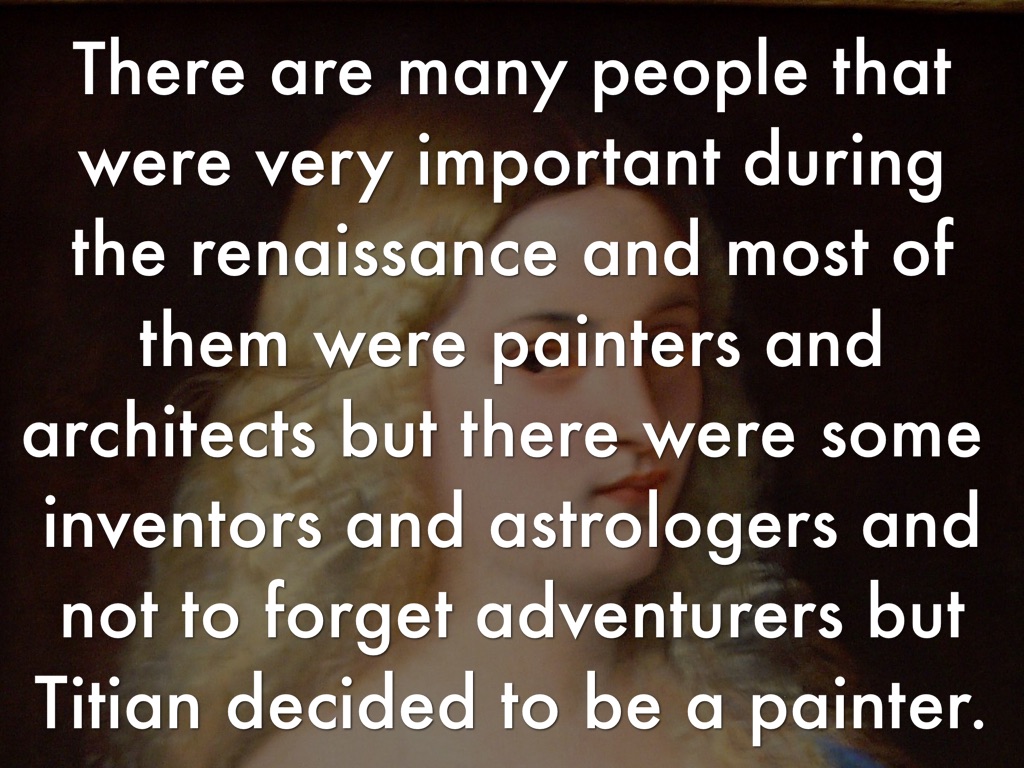 There are many people that were very important during the renaissance and most of them were painters and architects but there were some inventors and astrologers and not to forget adventurers but Titian decided to be a painter.