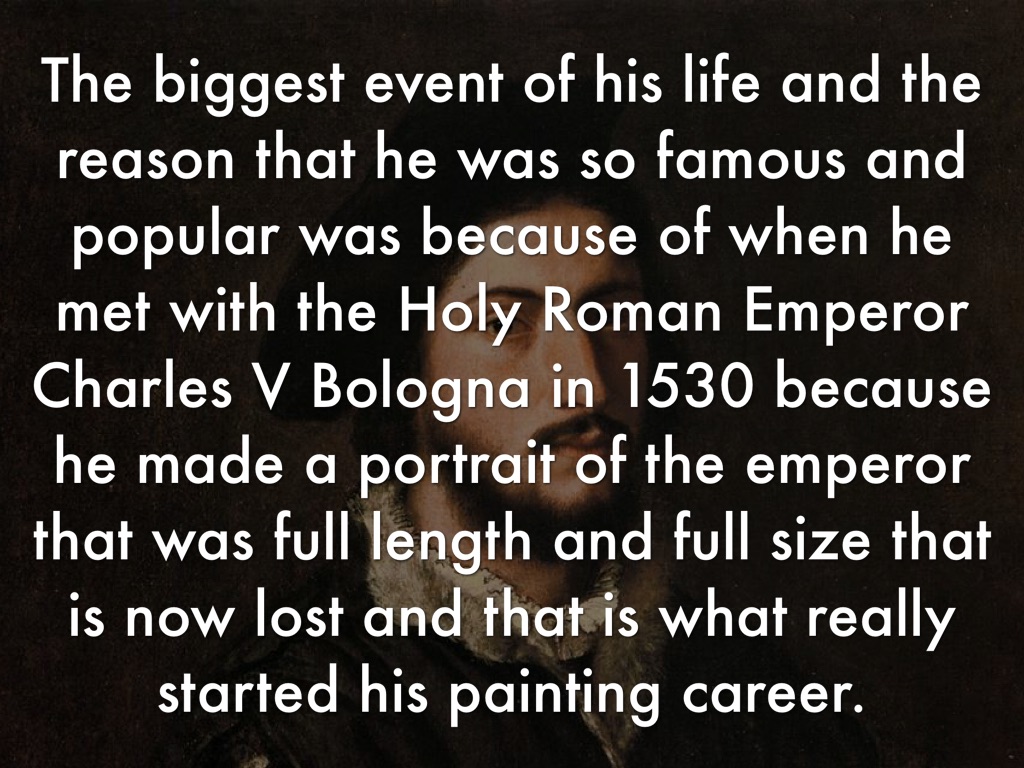 The biggest event of his life and the reason that he was so famous and popular was because of when he met with the Holy Roman Emperor Charles V Bologna in 1530 because he made a portrait of the emperor that was full length and full size that is now lost and that is what really started his painting career.