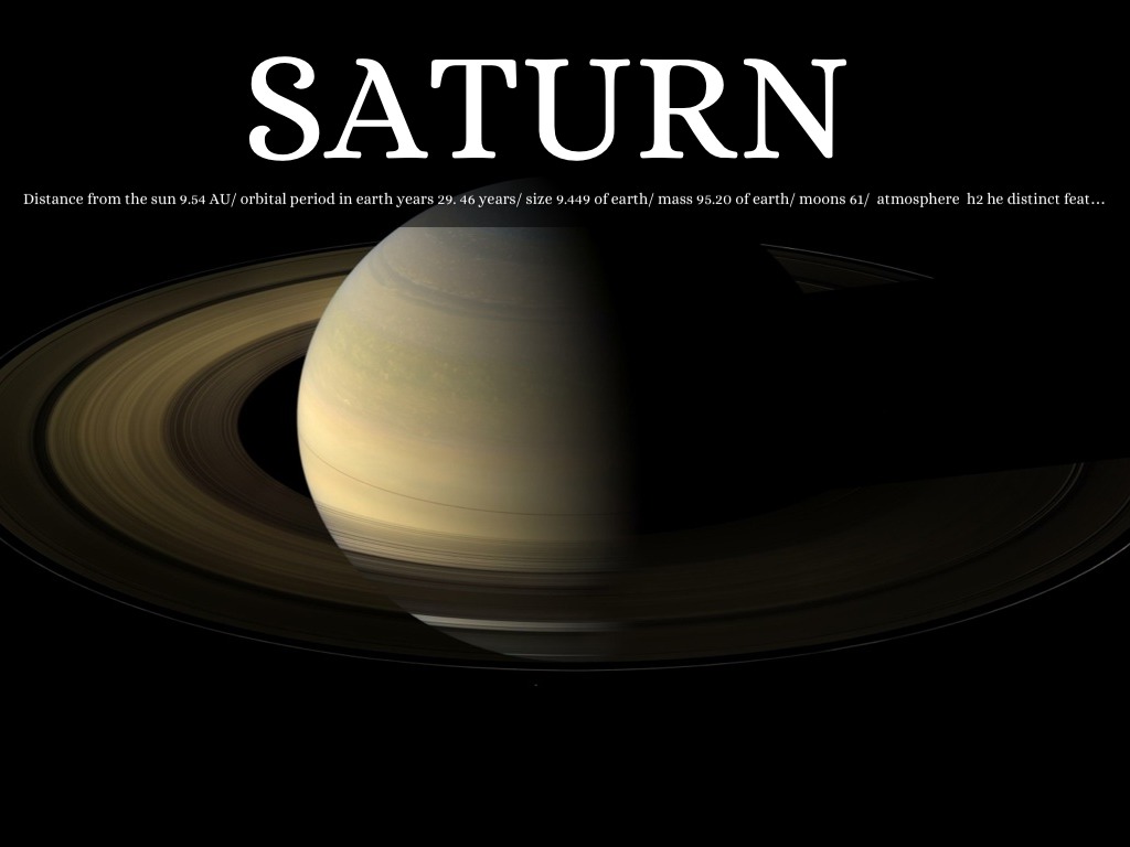 Distance from the sun 9.54 AU/ orbital period in earth years 29. 46 years/ size 9.449 of earth/ mass 95.20 of earth/ moons 61/ atmosphere h2 he distinct featuresSaturn is the sixth planet from the Sun and the second largest planet in the Solar System, after Jupiter. Named after the Roman god Saturn, its astronomical symbol (♄) represents the god's sickle. Saturn is a gas giant with an average radius about nine times that of Earth.[12][13] While only one-eighth the average density of Earth, with its larger volume Saturn is just over 95 times as massive as Earth.[14][15][16]