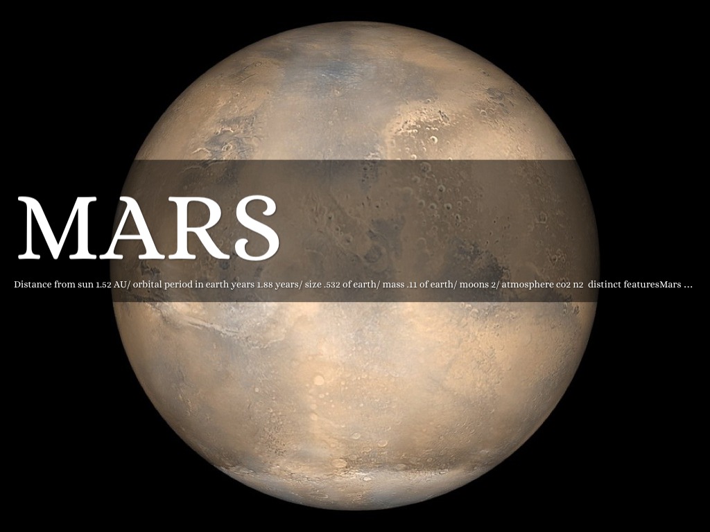 Distance from sun 1.52 AU/ orbital period in earth years 1.88 years/ size .532 of earth/ mass .11 of earth/ moons 2/ atmosphere co2 n2 distinct featuresMars is the fourth planet from the Sun and the second smallest planet in the Solar System. Named after the Roman god of war, it is often described as the "Red Planet", as the iron oxide prevalent on its surface gives it a reddish appearance.[14] Mars is a terrestrial planet with a thin atmosphere, having surface features reminiscent both of the impact craters of the Moon and the volcanoes, valleys, deserts, and polar ice caps of Earth. The rotational period and seasonal cycles of Mars are likewise similar to those of Earth, as is the tilt that produces the seasons.