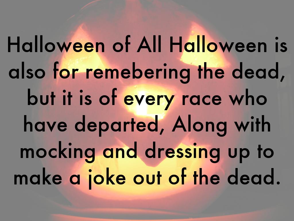 Halloween of All Halloween is also for remebering the dead, but it is of every race who have departed, Along with mocking and dressing up to make a joke out of the dead.