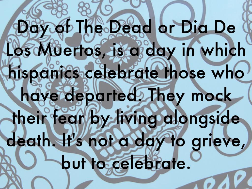 Day of The Dead or Dia De Los Muertos, is a day in which hispanics celebrate those who have departed. They mock their fear by living alongside death. It's not a day to grieve, but to celebrate.