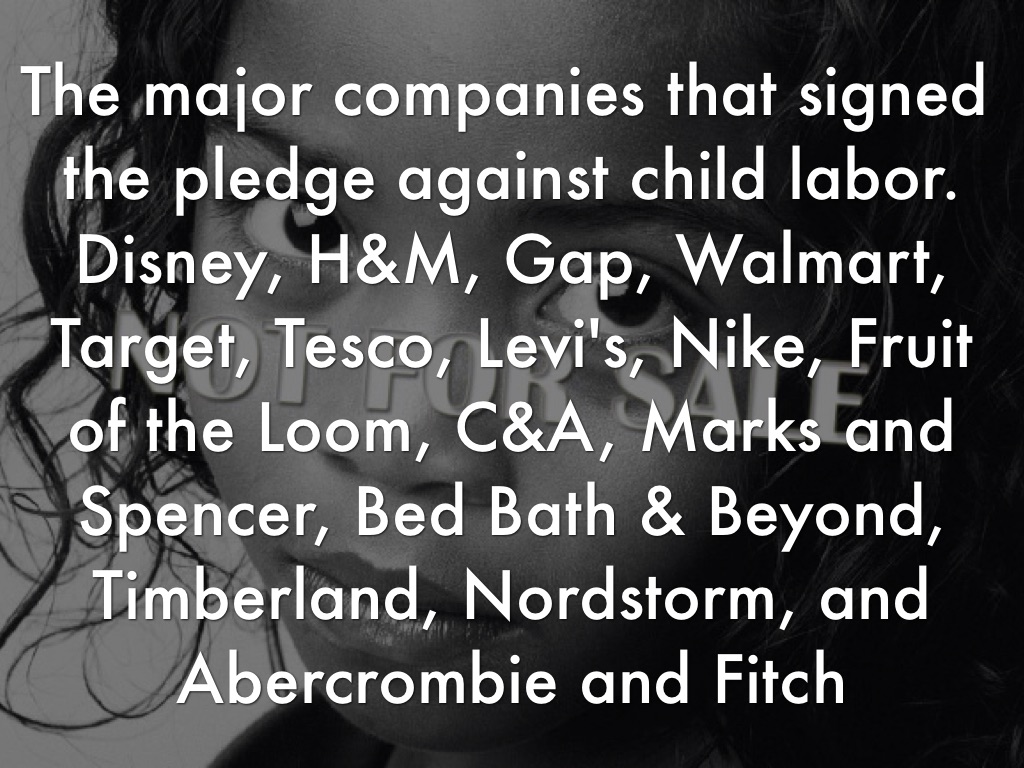 The major companies that signed the pledge against child labor. Disney, H&M, Gap, Walmart, Target, Tesco, Levi's, Nike, Fruit of the Loom, C&A, Marks and Spencer, Bed Bath & Beyond, Timberland, Nordstorm, and Abercrombie and Fitch