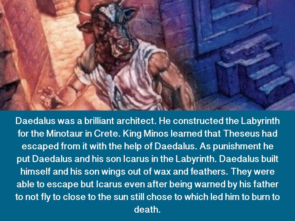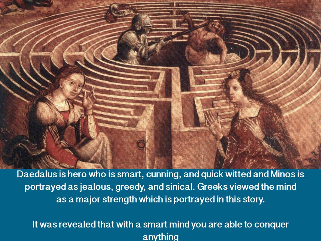 Daedalus is hero who is smart, cunning, and quick witted and Minos is portrayed as jealous, greedy, and sinical. Greeks viewed the mind
