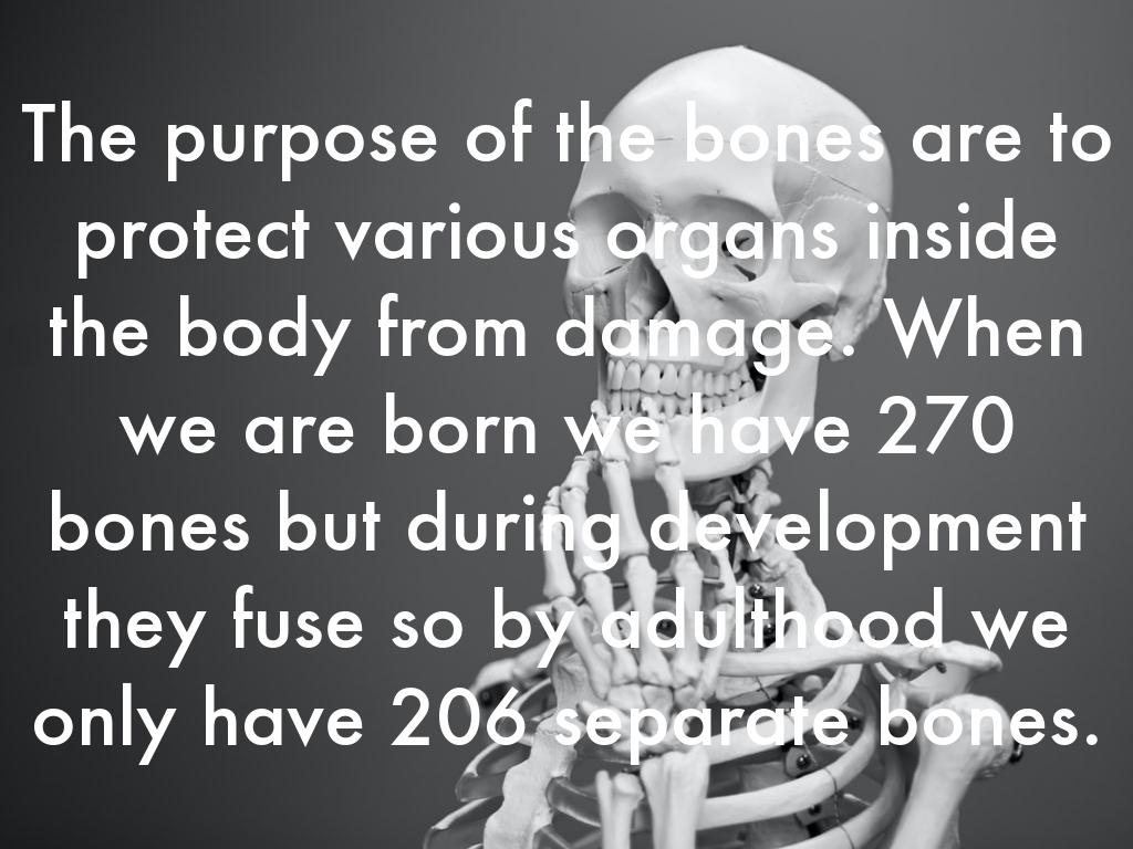 The purpose of the bones are to protect various organs inside the body from damage. When we are born we have 270 bones but during development they fuse so by adulthood we only have 206 separate bones.