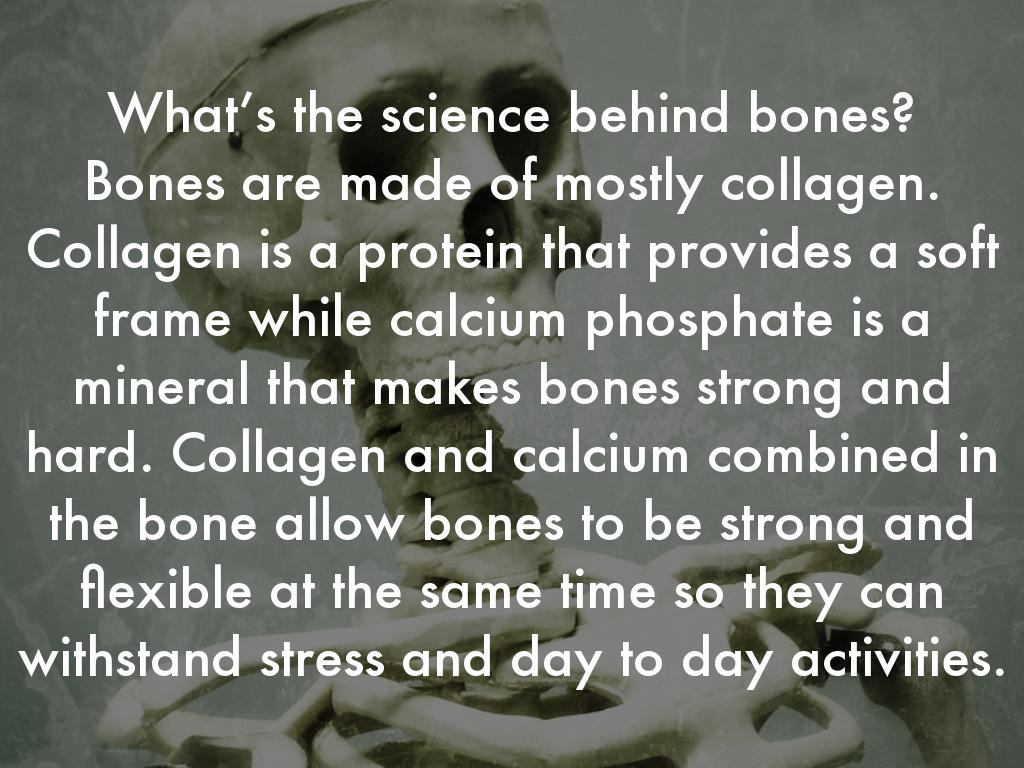 What’s the science behind bones? Bones are made of mostly collagen. Collagen is a protein that provides a soft frame while calcium phosphate is a mineral that makes bones strong and hard. Collagen and calcium combined in the bone allow bones to be strong and flexible at the same time so they can withstand stress and day to day activities.