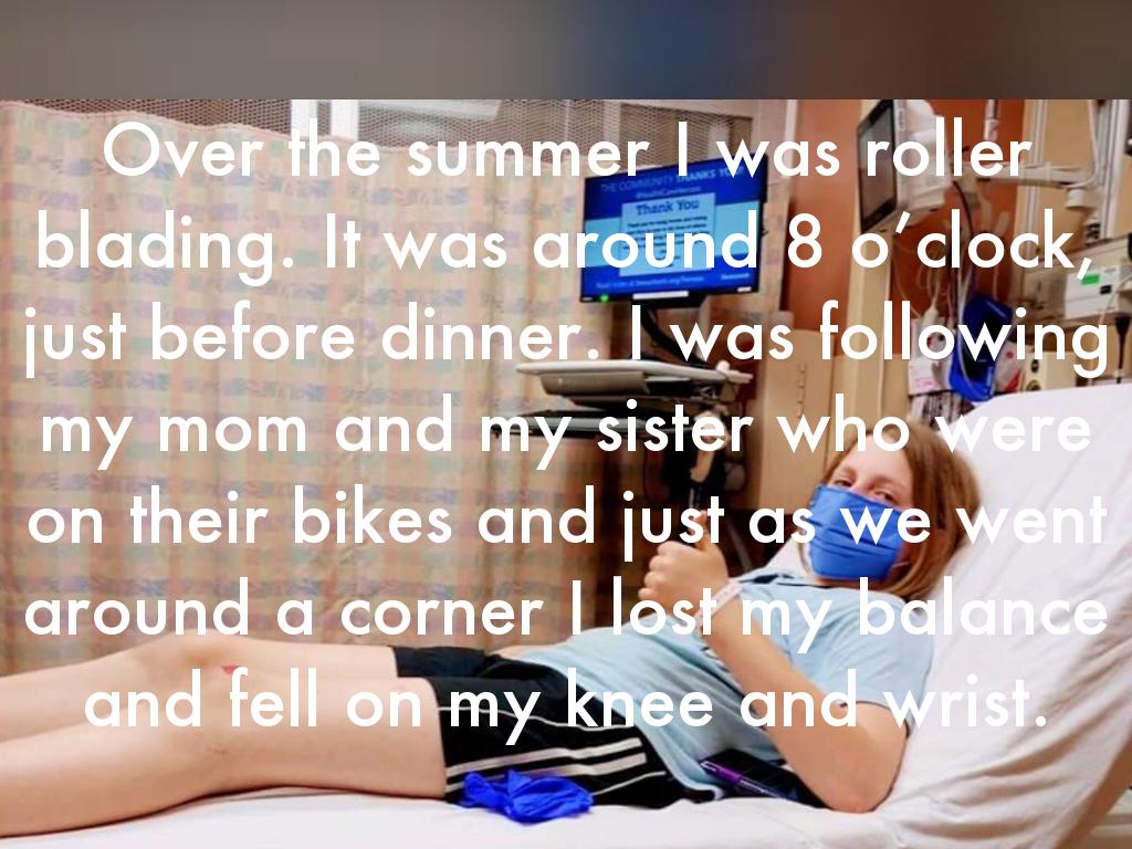 Over the summer I was roller blading. It was around 8 o’clock, just before dinner. I was following my mom and my sister who were on their bikes and just as we went around a corner I lost my balance and fell on my knee and wrist.