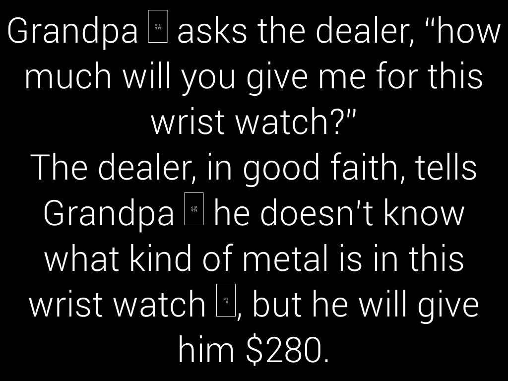 Grandpa 👴 asks the dealer, “how much will you give me for this wrist watch?” The dealer, in good faith, tells Grandpa 👴 he doesn’t know what kind of metal is in this wrist watch ⌚️, but he will give him $280.