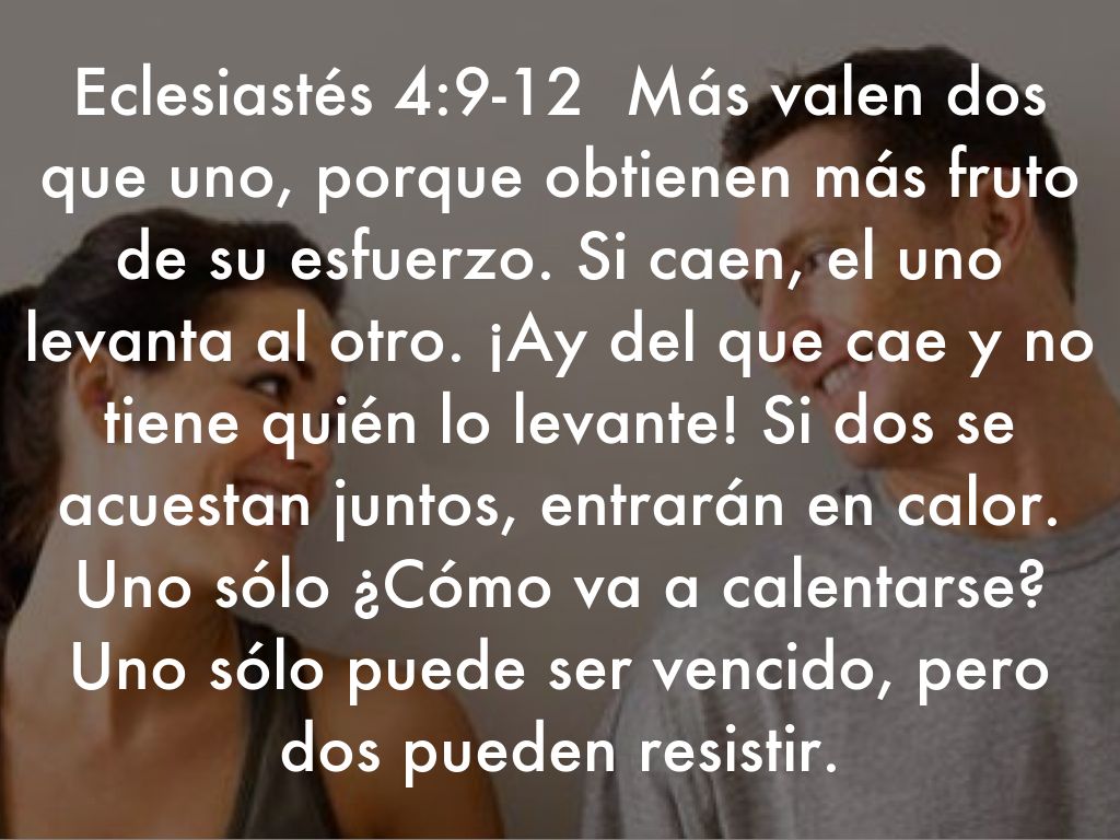 Eclesiastés 4:9-12 Más valen dos que uno, porque obtienen más fruto de su esfuerzo. Si caen, el uno levanta al otro. ¡Ay del que cae y no tiene quién lo levante! Si dos se acuestan juntos, entrarán en calor. Uno sólo ¿Cómo va a calentarse? Uno sólo puede ser vencido, pero dos pueden resistir.