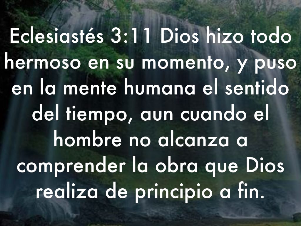 Eclesiastés 3:11 Dios hizo todo hermoso en su momento, y puso en la mente humana el sentido del tiempo, aun cuando el hombre no alcanza a comprender la obra que Dios realiza de principio a fin.