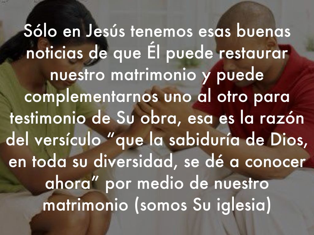 Sólo en Jesús tenemos esas buenas noticias de que Él puede restaurar nuestro matrimonio y puede complementarnos uno al otro para testimonio de Su obra, esa es la razón del versículo “que la sabiduría de Dios, en toda su diversidad, se dé a conocer ahora” por medio de nuestro matrimonio (somos Su iglesia)