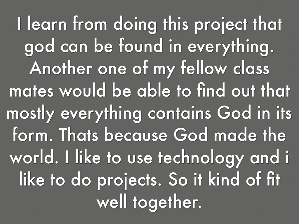 I learn from doing this project that god can be found in everything. Another one of my fellow class mates would be able to find out that mostly everything contains God in its form. Thats because God made the world. I like to use technology and i like to do projects. So it kind of fit well together.