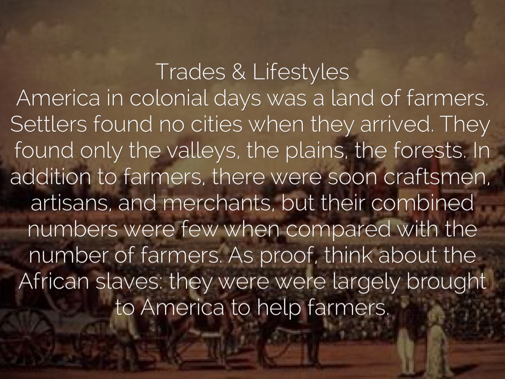 America in colonial days was a land of farmers. Settlers found no cities when they arrived. They found only the valleys, the plains, the forests. In addition to farmers, there were soon craftsmen, artisans, and merchants, but their combined numbers were few when compared with the number of farmers. As proof, think about the African slaves: they were were largely brought to America to help farmers.