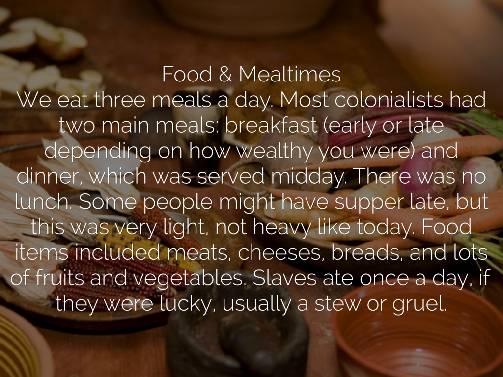 We eat three meals a day. Most colonialists had two main meals: breakfast (early or late depending on how wealthy you were) and dinner, which was served midday. There was no lunch. Some people might have supper late, but this was very light, not heavy like today. Food items included meats, cheeses, breads, and lots of fruits and vegetables. Slaves ate once a day, if they were lucky, usually a stew or gruel.
