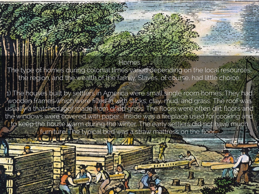 The type of homes during colonial times varied depending on the local resources, the region, and the wealth of the family. Slaves, of course, had little choice.