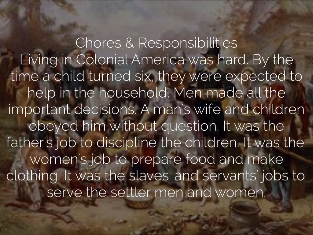 Living in Colonial America was hard. By the time a child turned six, they were expected to help in the household. Men made all the important decisions. A man's wife and children obeyed him without question. It was the father's job to discipline the children. It was the women's job to prepare food and make clothing. It was the slaves' and servants' jobs to serve the settler men and women.