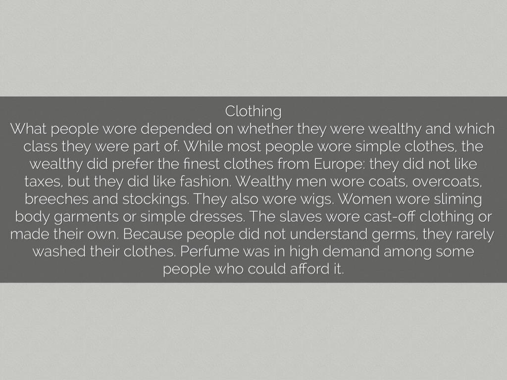 What people wore depended on whether they were wealthy and which class they were part of. While most people wore simple clothes, the wealthy did prefer the finest clothes from Europe: they did not like taxes, but they did like fashion. Wealthy men wore coats, overcoats, breeches and stockings. They also wore wigs. Women wore sliming body garments or simple dresses. The slaves wore cast-off clothing or made their own. Because people did not understand germs, they rarely washed their clothes. Perfume was in high demand among some people who could afford it.