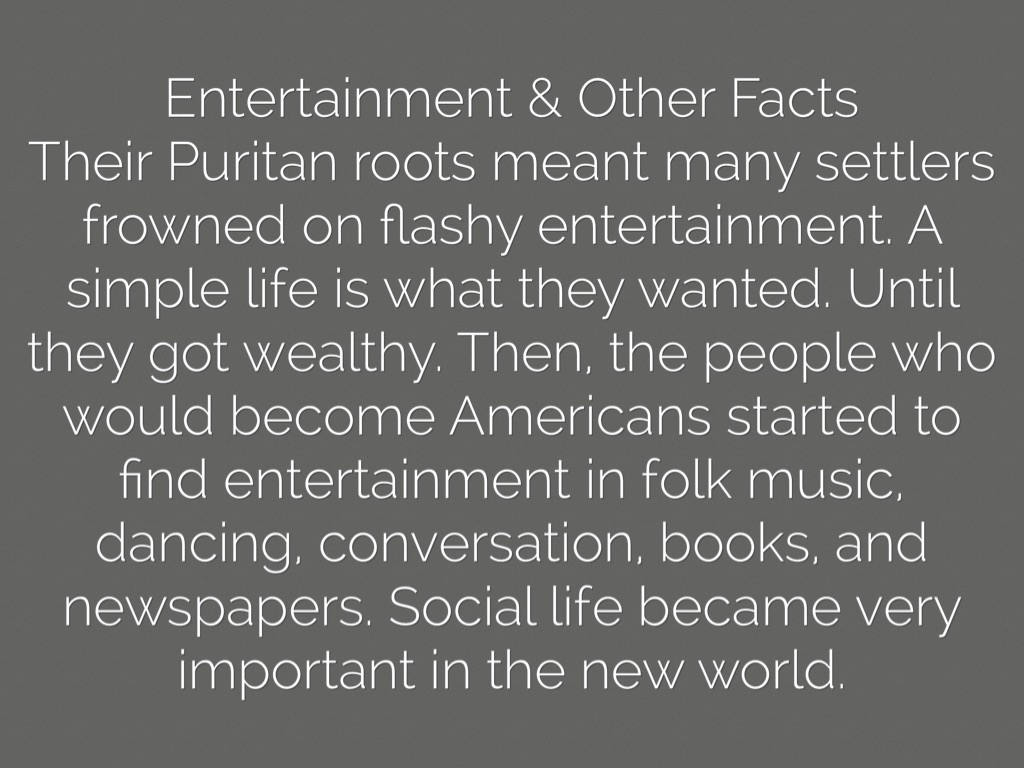 Their Puritan roots meant many settlers frowned on flashy entertainment. A simple life is what they wanted. Until they got wealthy. Then, the people who would become Americans started to find entertainment in folk music, dancing, conversation, books, and newspapers. Social life became very important in the new world.