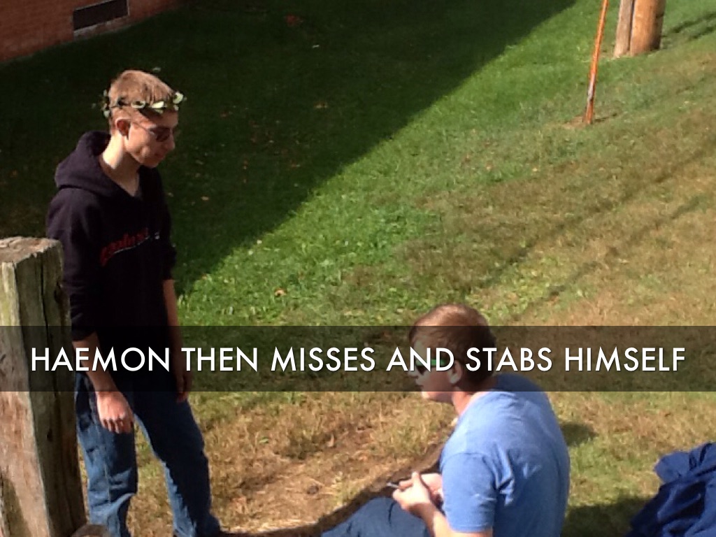 HAEMON THEN MISSES AND STABS HIMSELF