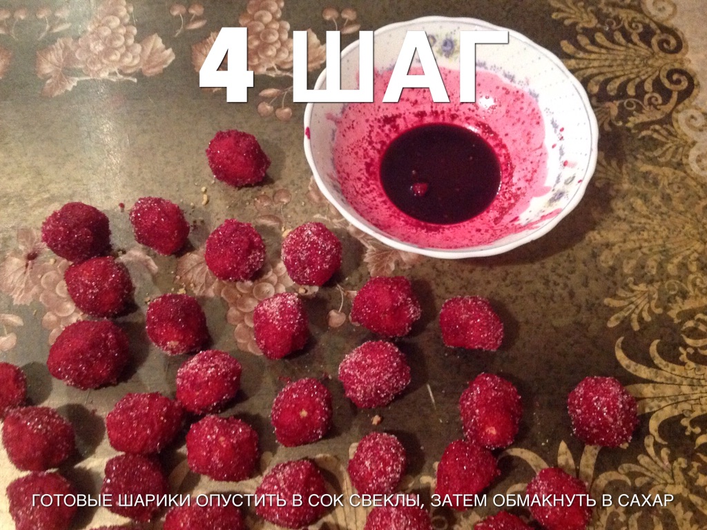 ГОТОВЫЕ ШАРИКИ ОПУСТИТЬ В СОК СВЕКЛЫ, ЗАТЕМ ОБМАКНУТЬ В САХАР