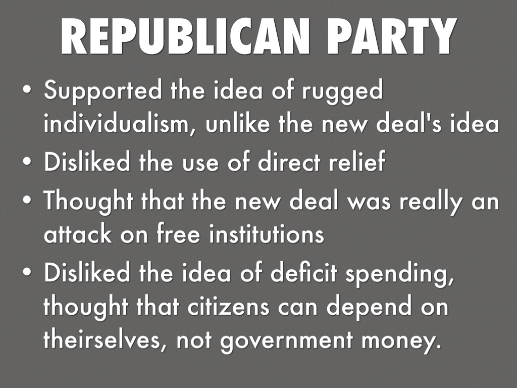 Supported the idea of rugged individualism, unlike the new deal's idea
