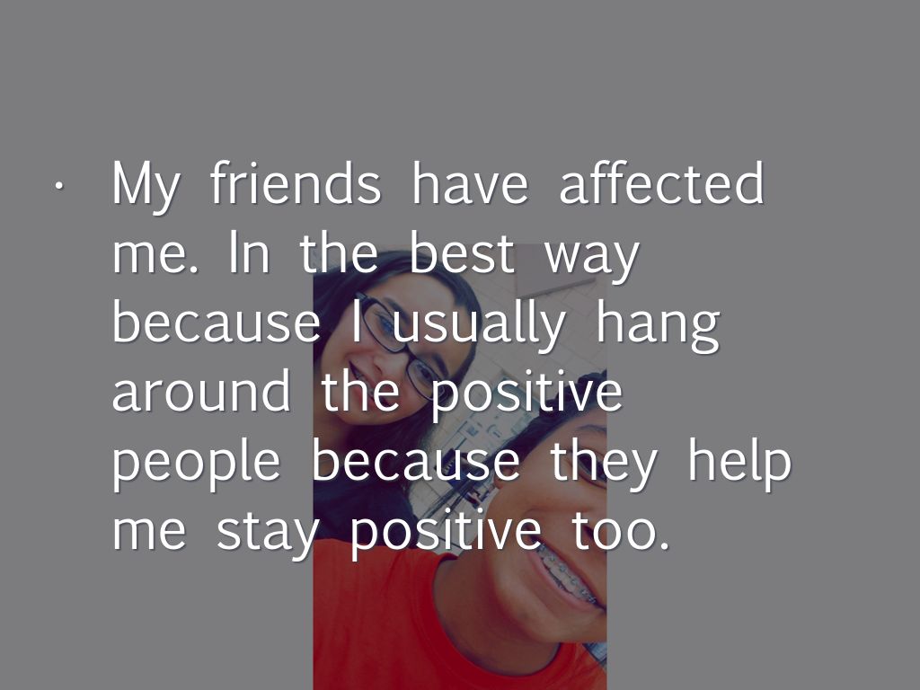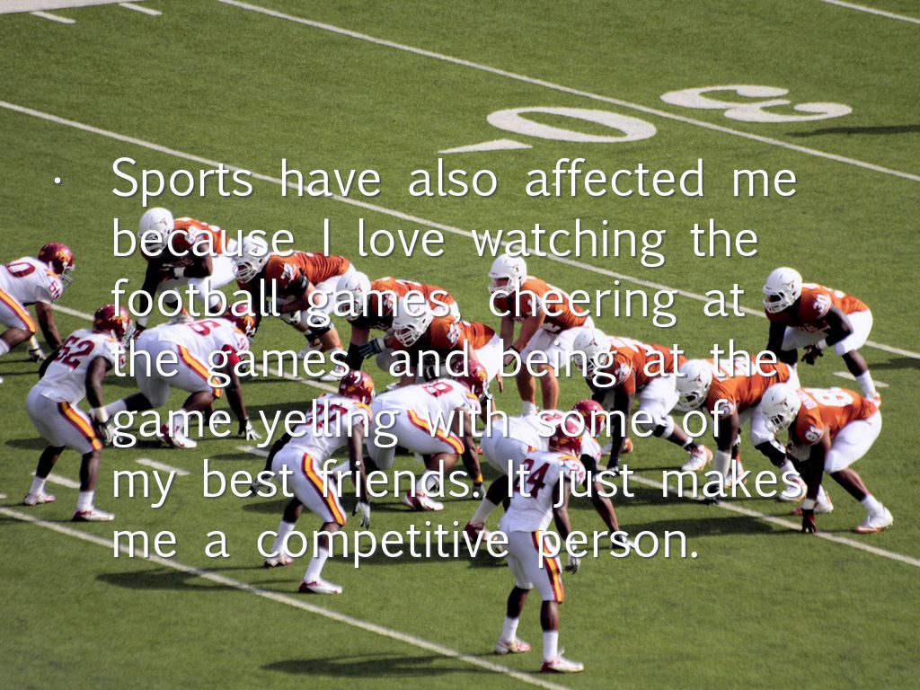 Sports have also affected me because I love watching the football games, cheering at the games, and being at the game yelling with some of my best friends. It just makes me a competitive person.