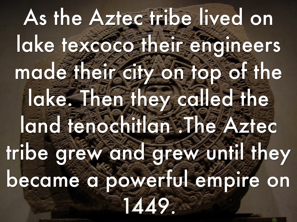 As the Aztec tribe lived on lake texcoco their engineers made their city on top of the lake. Then they called the land tenochitlan .The Aztec tribe grew and grew until they became a powerful empire on 1449.