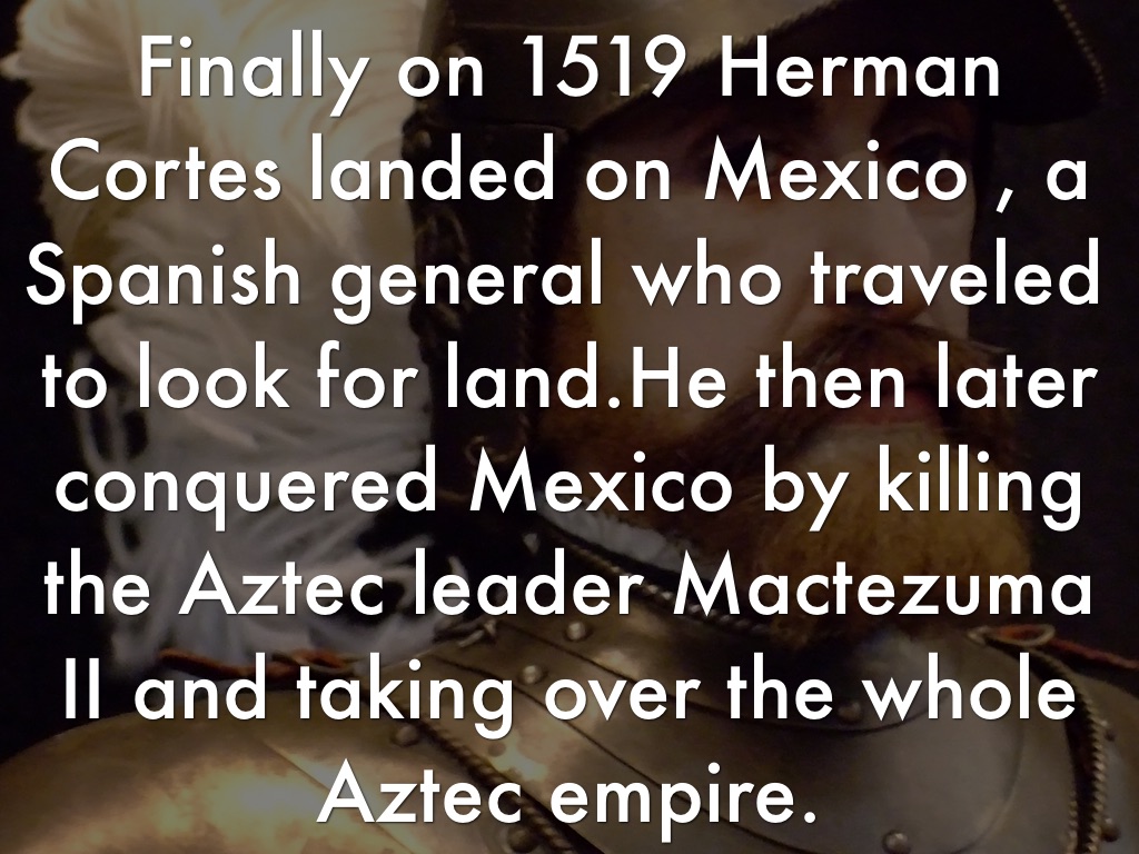 Finally on 1519 Herman Cortes landed on Mexico , a Spanish general who traveled to look for land.He then later conquered Mexico by killing the Aztec leader Mactezuma II and taking over the whole Aztec empire.