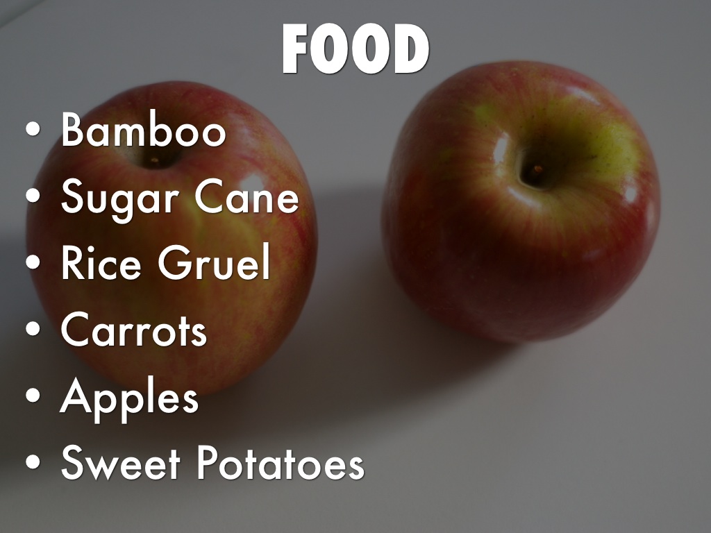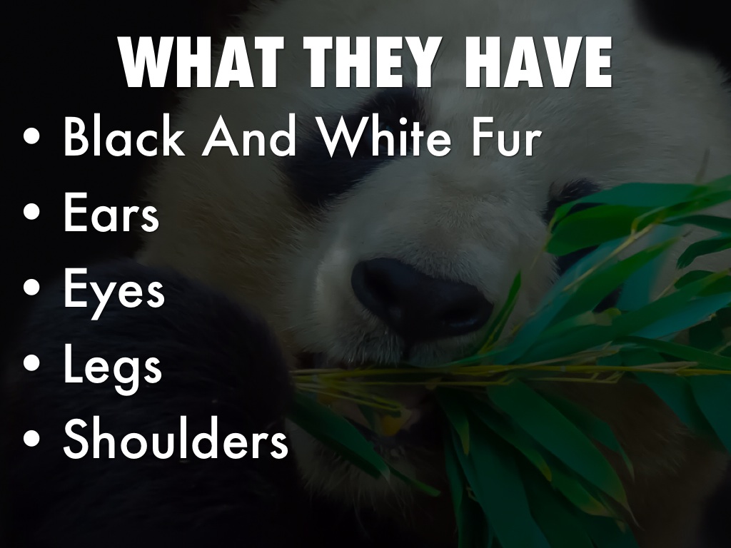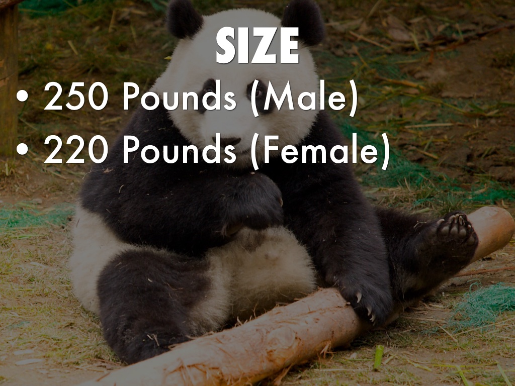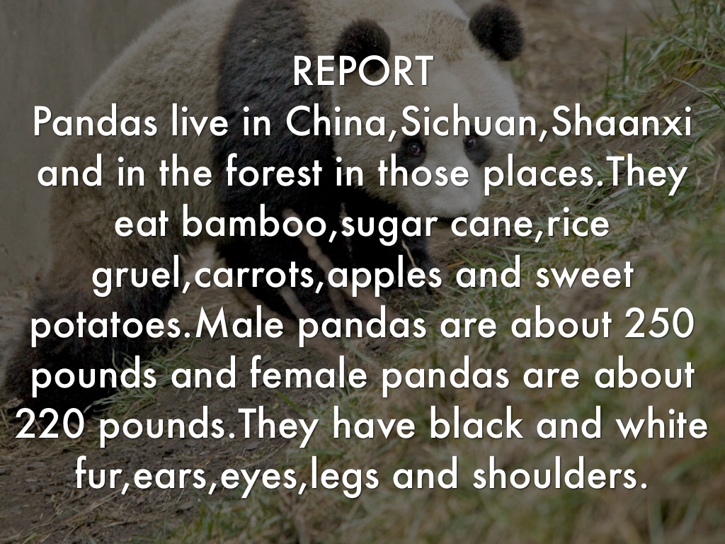 REPORT Pandas live in China,Sichuan,Shaanxi and in the forest in those places.They eat bamboo,sugar cane,rice gruel,carrots,apples and sweet potatoes.Male pandas are about 250 pounds and female pandas are about 220 pounds.They have black and white fur,ears,eyes,legs and shoulders.