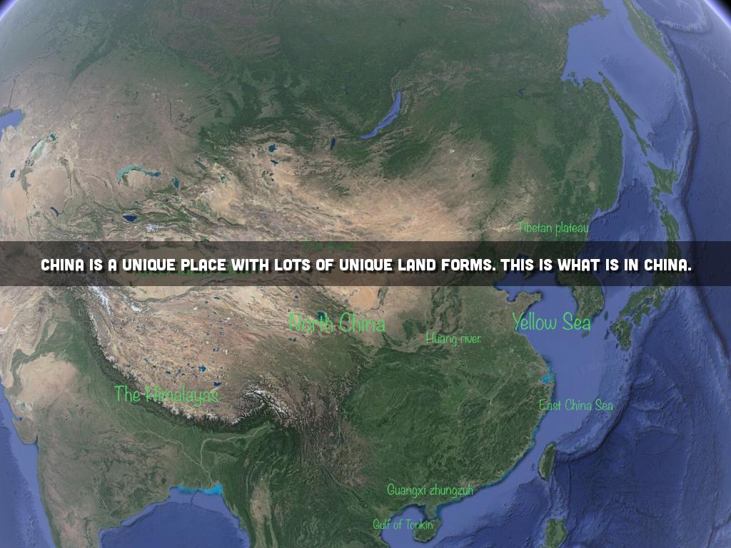 CHINA IS A UNIQUE PLACE WITH LOTS OF UNIQUE LAND FORMS. THIS IS WHAT IS IN CHINA.