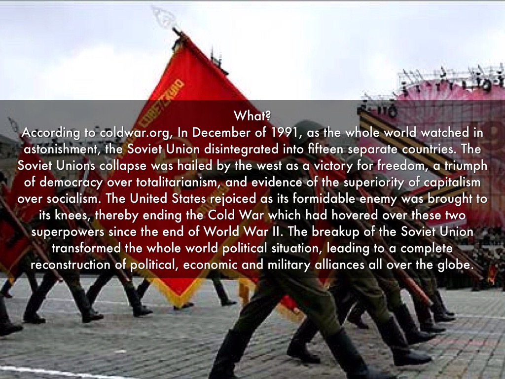 According to coldwar.org, In December of 1991, as the whole world watched in astonishment, the Soviet Union disintegrated into fifteen separate countries. The Soviet Unions collapse was hailed by the west as a victory for freedom, a triumph of democracy over totalitarianism, and evidence of the superiority of capitalism over socialism. The United States rejoiced as its formidable enemy was brought to its knees, thereby ending the Cold War which had hovered over these two superpowers since the end of World War II. The breakup of the Soviet Union transformed the whole world political situation, leading to a complete reconstruction of political, economic and military alliances all over the globe.