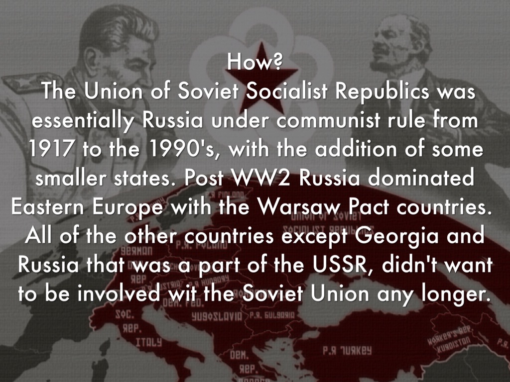 The Union of Soviet Socialist Republics was essentially Russia under communist rule from 1917 to the 1990's, with the addition of some smaller states. Post WW2 Russia dominated Eastern Europe with the Warsaw Pact countries. All of the other countries except Georgia and Russia that was a part of the USSR, didn't want to be involved wit the Soviet Union any longer.