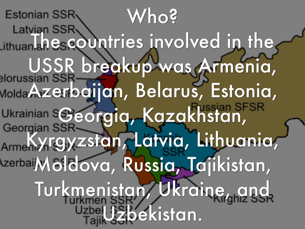 The countries involved in the USSR breakup was Armenia, Azerbaijan, Belarus, Estonia, Georgia, Kazakhstan, Kyrgyzstan, Latvia, Lithuania, Moldova, Russia, Tajikistan, Turkmenistan, Ukraine, and Uzbekistan.