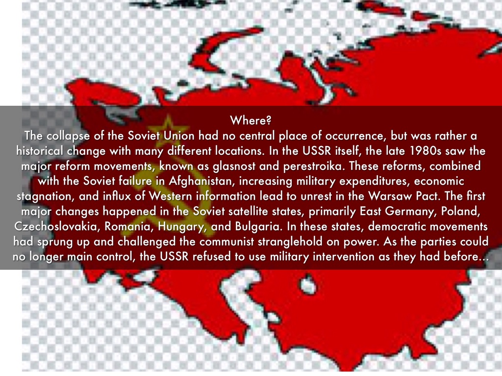The collapse of the Soviet Union had no central place of occurrence, but was rather a historical change with many different locations. In the USSR itself, the late 1980s saw the major reform movements, known as glasnost and perestroika. These reforms, combined with the Soviet failure in Afghanistan, increasing military expenditures, economic stagnation, and influx of Western information lead to unrest in the Warsaw Pact. The first major changes happened in the Soviet satellite states, primarily East Germany, Poland, Czechoslovakia, Romania, Hungary, and Bulgaria. In these states, democratic movements had sprung up and challenged the communist stranglehold on power. As the parties could no longer main control, the USSR refused to use military intervention as they had before. Subsequently, the regimes rapidly collapsed in these countries from the period of 1989-1991. Later, the collapse began to spread to the Baltic states, Belorussia, Ukraine, Georgia and Russia itself. By 1993, all of these countries had become independent, along with the Central Asian states, where the collapse occurred last.